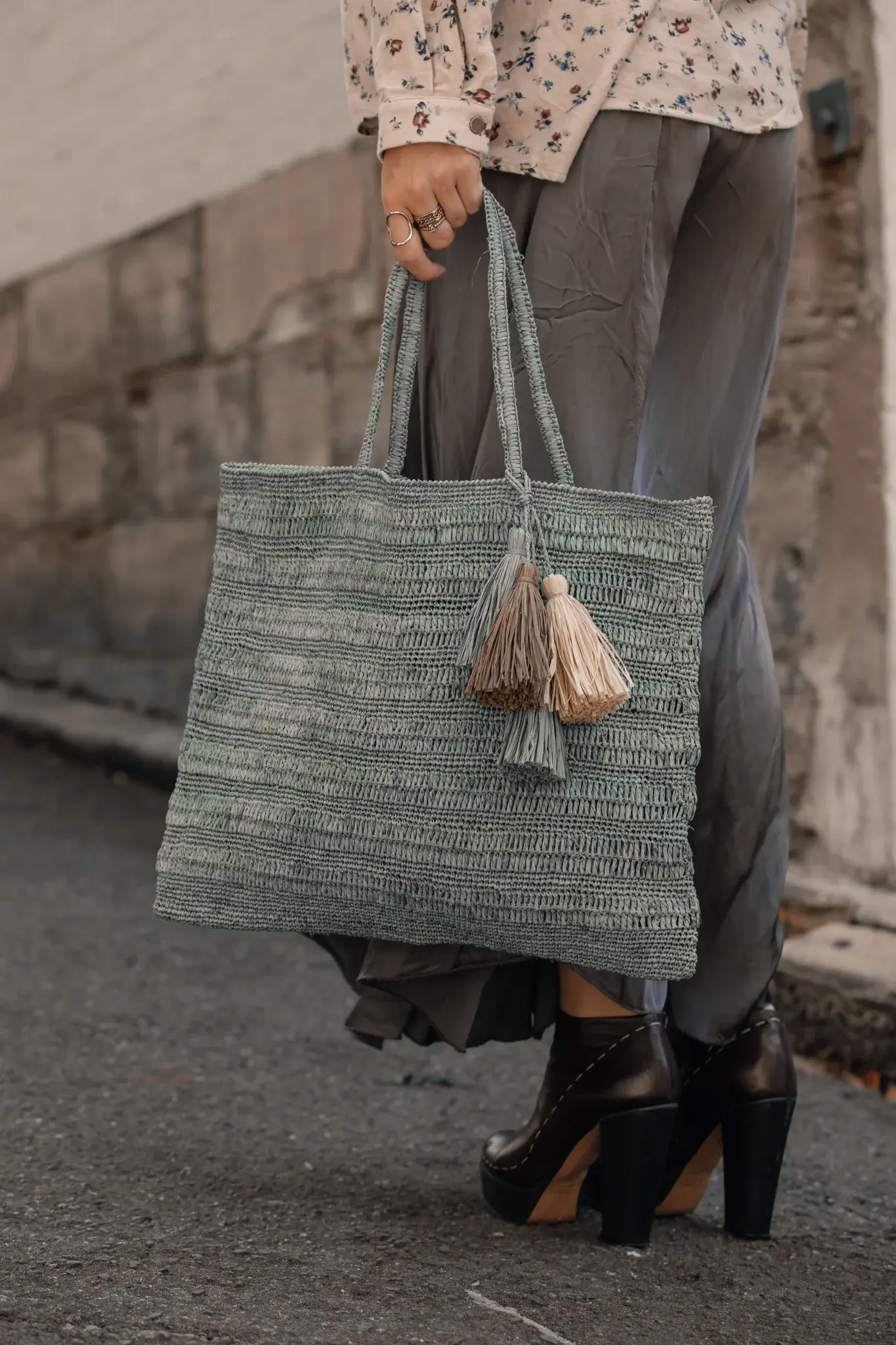 Alternating single and double stitches, macramé handles with 4 pompoms in contrasting colours.