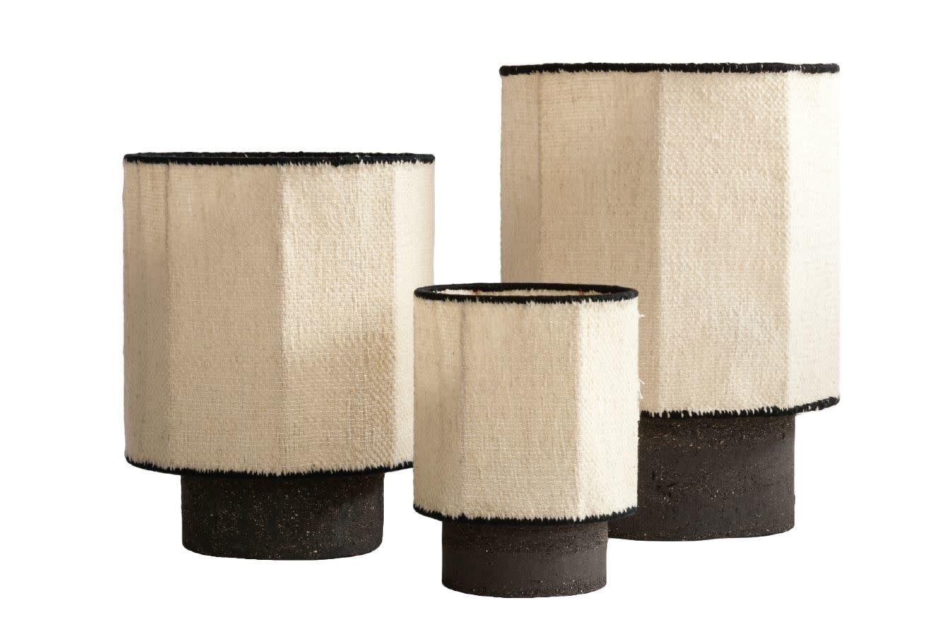 • The Osh Kalé lamp features a handcrafted black clay stoneware base paired with a soft ecru wool shade with a black edge. A warm, sculptural statement piece with an artisanal feel.