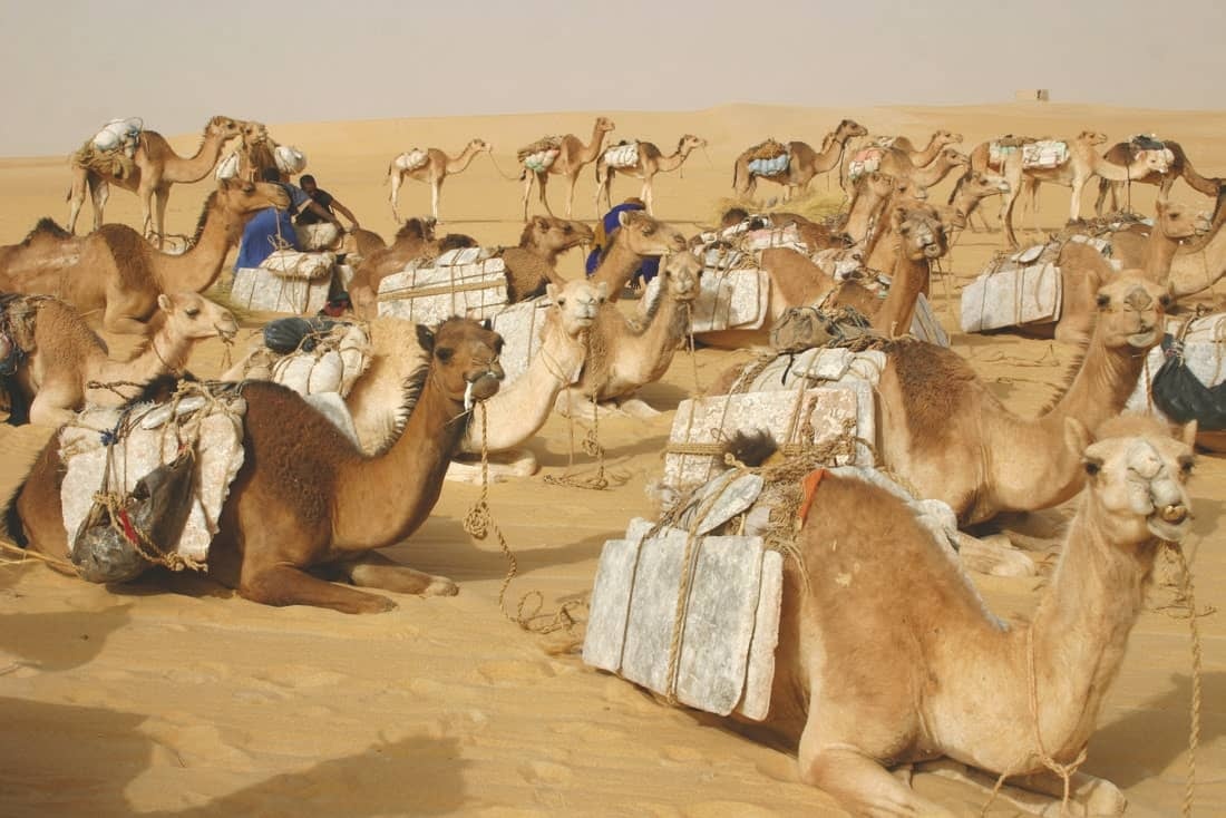 Salt from the Sahara desert was one of the major trade goods of ancient West Africa where very little naturally occurring deposits of the mineral could be found. Transported via camel caravans and by boat along such rivers as the Niger and Senegal, salt found its way to trading centres like Koumbi Saleh, Niani, and timbuktu, where it was either passed further south or exchanged for other goods such as ivory, hides, copper, iron, and cereals. The most common exchange was salt for gold dust that came from the mines of southern West Africa. Indeed, salt was such a precious commodity that it was quite literally worth its weight in gold in some parts of West Africa.