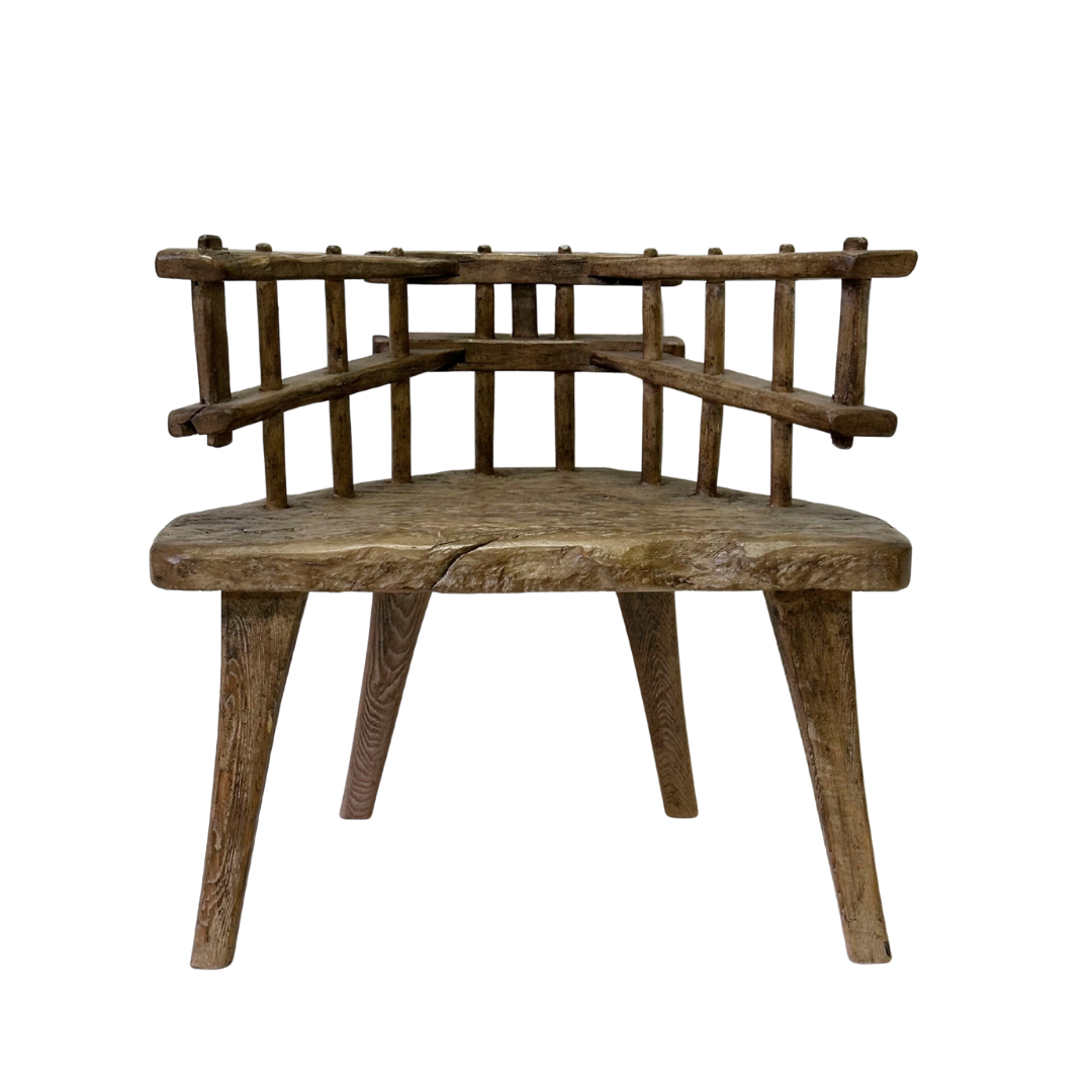 This unique wooden chair from China is a rare example of traditional handcrafted furniture. The expressive backrest, with vertical slats and a subtly curved form, gives the chair a strong sculptural and almost architectural presence.
