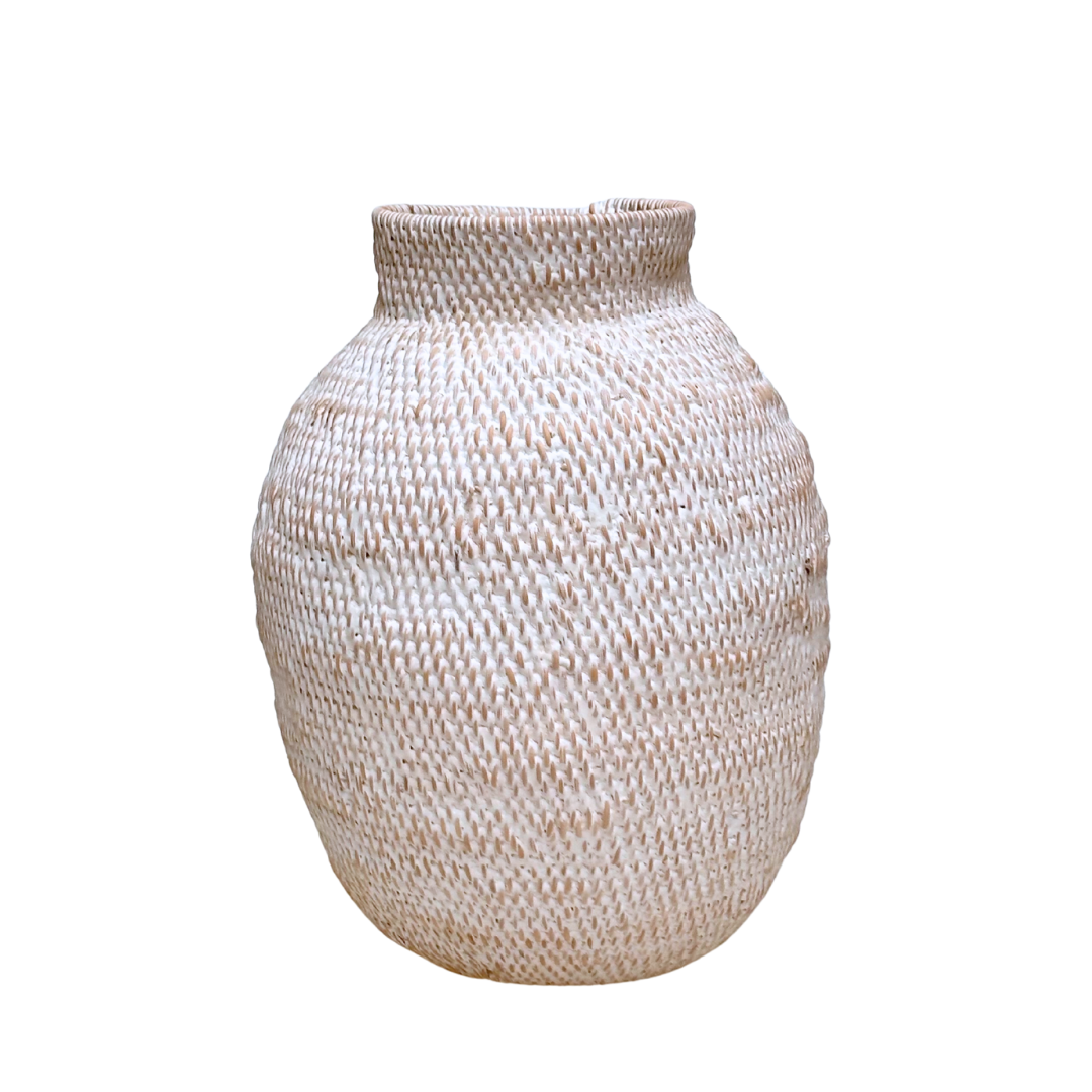 De Buhera Kruikmand Wit #9 is een authentiek stukje Zimbabweaanse vakmanschap. Deze manden worden traditioneel met de hand gevlochten door Buhera-vrouwen in het oosten van Zimbabwe, waarbij eeuwenoude technieken van generatie op generatie worden doorgegeven.