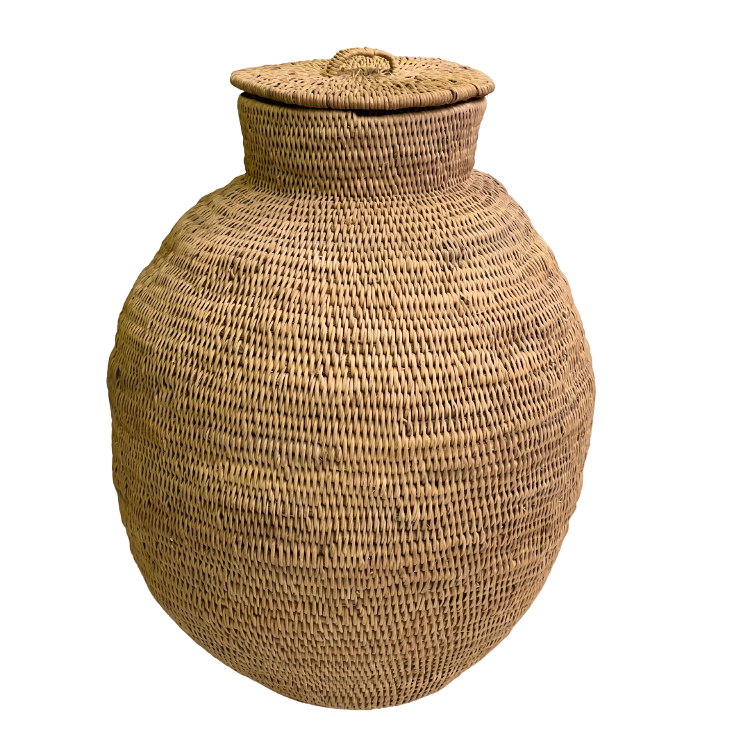 De Buhera Kruikmand Natural #16 is een authentiek stukje Zimbabweaanse vakmanschap. Deze manden worden traditioneel met de hand gevlochten door Buhera-vrouwen in het oosten van Zimbabwe, waarbij eeuwenoude technieken van generatie op generatie worden doorgegeven.