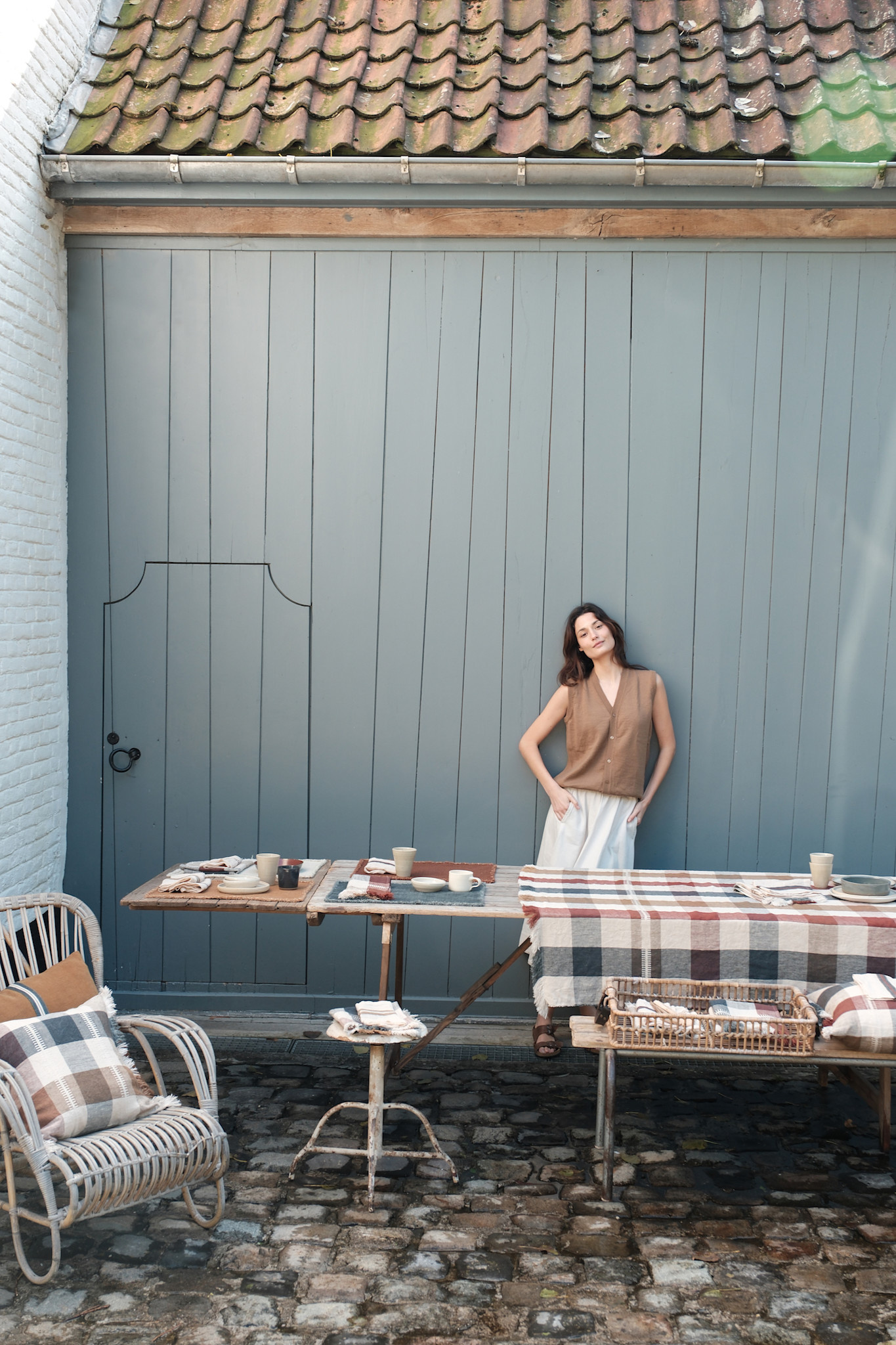 • De hoofdkleuren zijn warm eikenkleur, roestbruin, grijsblauw en gebroken wit.