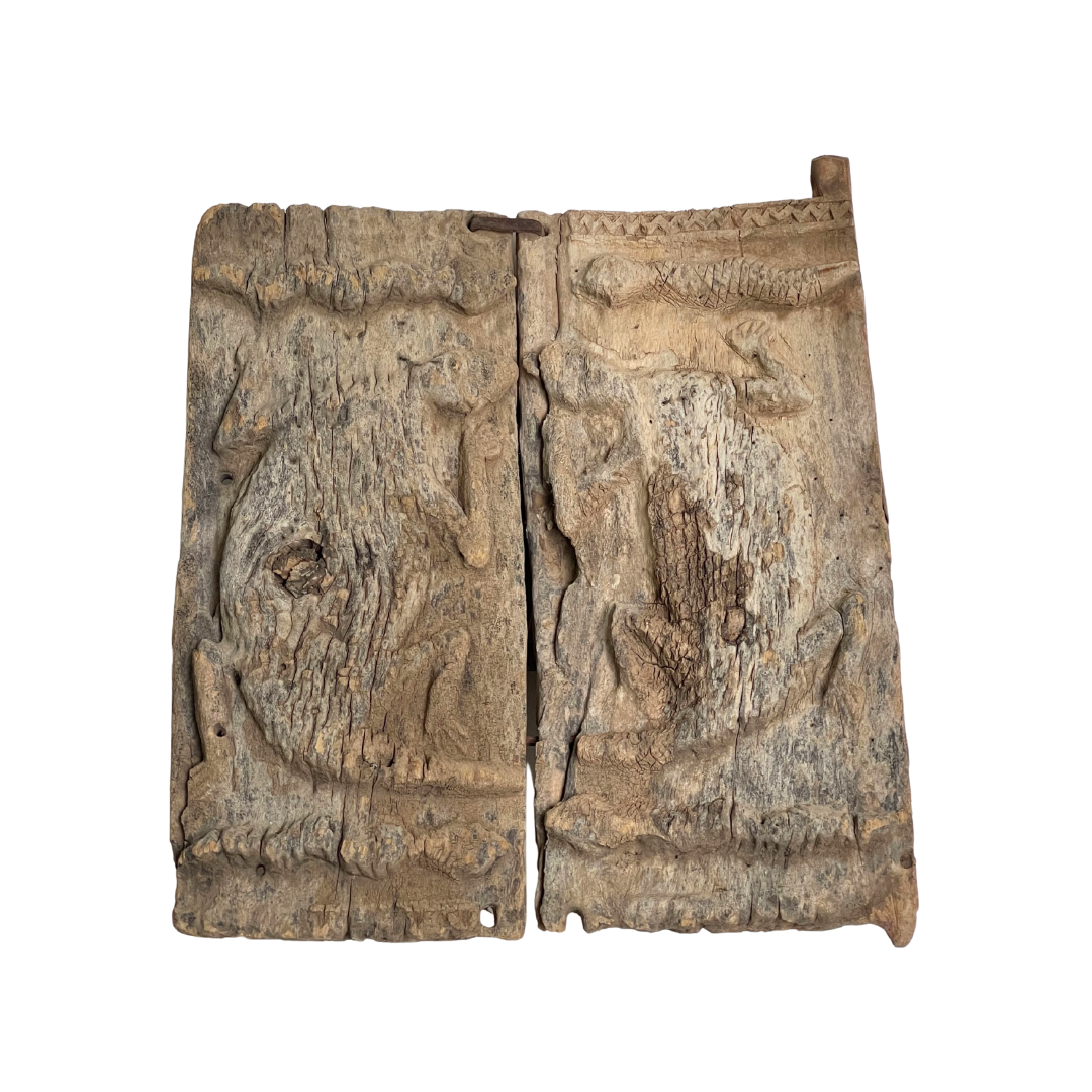 • Oude Dogon-deur uit Mali, handgesneden uit hardhout met symbolische reliëfs. Elk stuk vertelt verhalen over familie en spiritualiteit. Authentiek, uniek en met een prachtige verweerde patina — een kunstwerk vol geschiedenis.