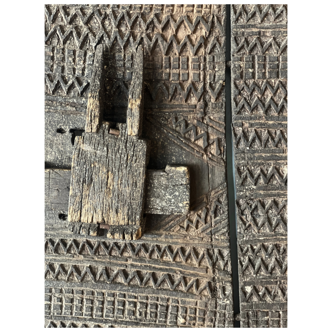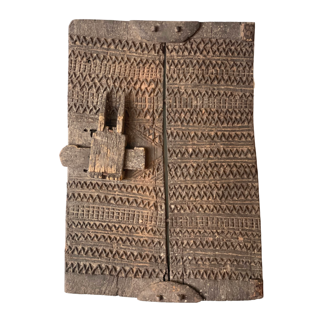 • Authentieke kleine oude graanzolderdeur van DOGON, bestaande uit 2 houten panelen die met metaal aan elkaar vastzitten. Elk gekerfd symbool heeft een betekenis die zijn bedoeld om de indringer ervan te weerhouden de graanzolder binnen te gaan.