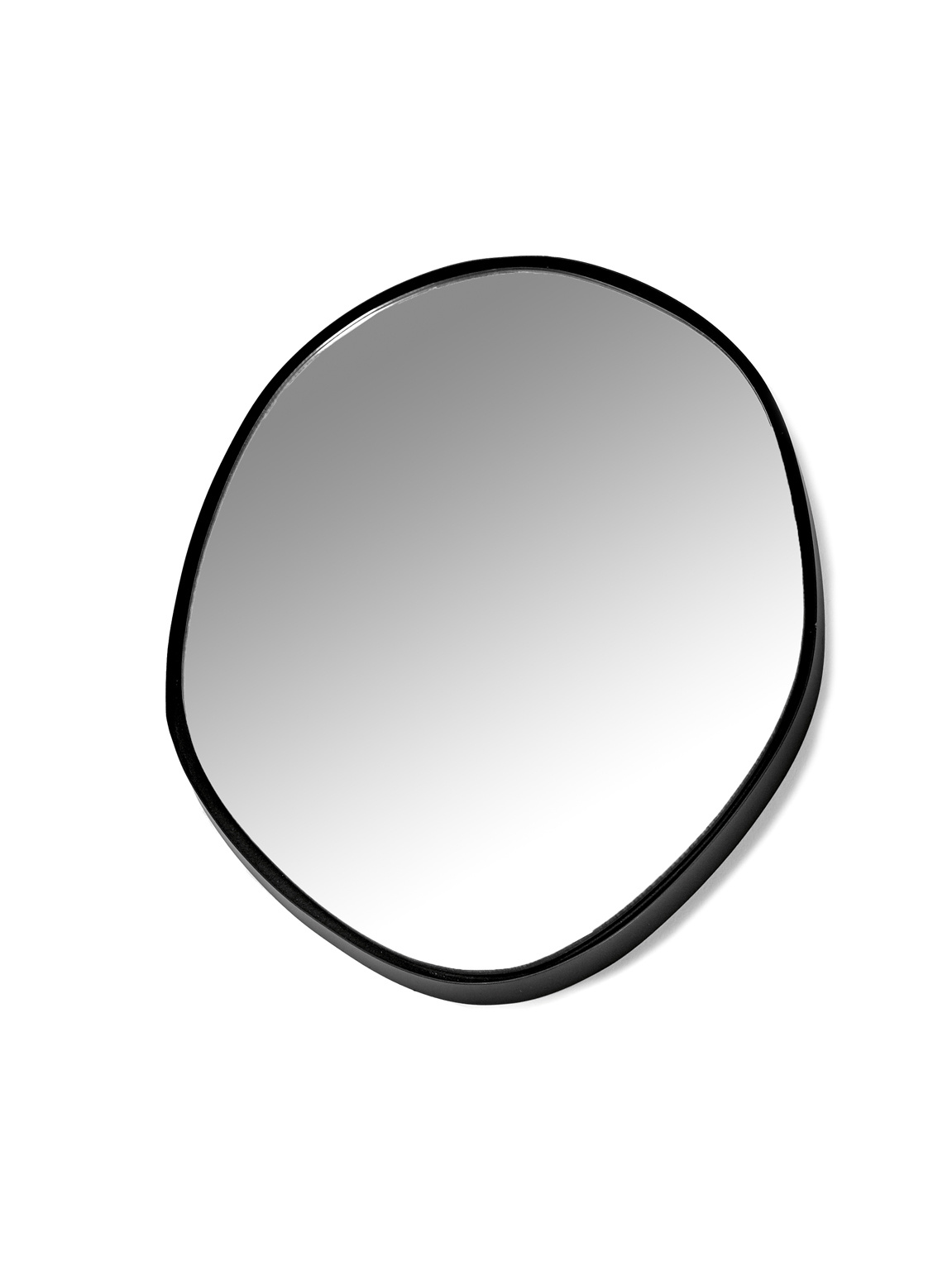 De speelse spiegeltjes van Marie Michielssen voor Serax zorgen met hun grote en kleine organische vormen, zwarte rand en reflectie van de rechte lijnen van de overige strakke objecten in de ruimte, zowel alleen als in groep.